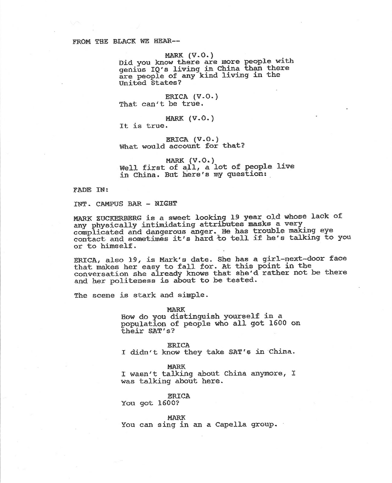 My point is if you've already seen the movie in the theaters, read the screenplay by Aaron Sorkin (one of the best you'll see this year) HERE, or even just the first page (click on jpeg below to enlarge), and you should see what I'm getting at.
